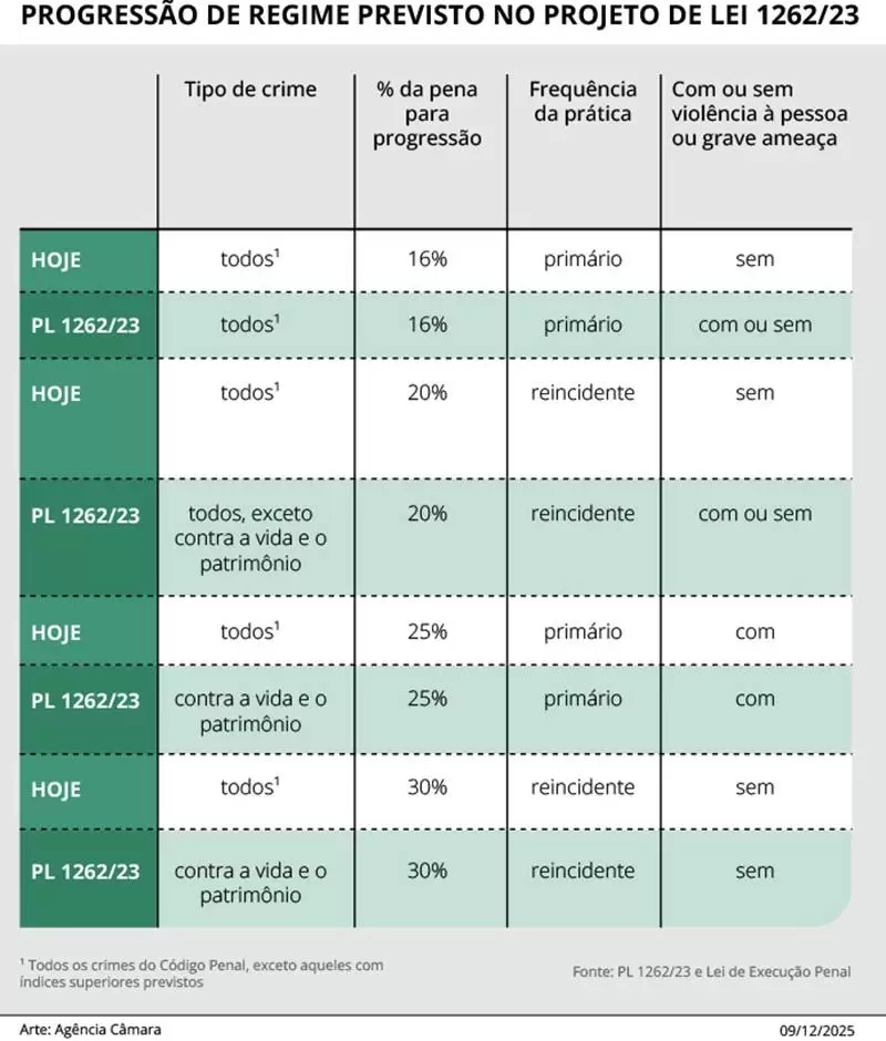 O relator, Paulinho da Força, também alterou a progressão de pena, permitindo que condenados por crimes com violência ou grave ameaça possam progredir com apenas 16% da pena cumprida, reduzindo ainda mais o tempo no regime fechado, medida criticada por setores do Judiciário e rejeitada em diversos destaques pela oposição ao projeto.