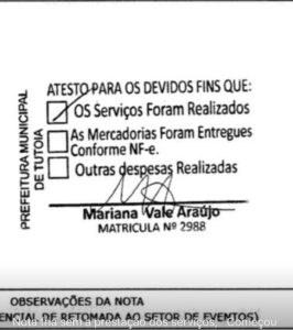 O que agrava ainda mais a situação é o fato de que a nota fiscal traz a assinatura da fiscal de contratos do município, Sra. Mariana Araújo, que atesta a execução do serviço contratado, mesmo antes do início oficial do carnaval daquele ano. Ou seja, a servidora pública teria confirmado a prestação do serviço sem que o evento sequer tivesse começado, o que, em tese, pode caracterizar atesto indevido de despesa pública.